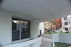The museum's main entrance is at the center of the Fifth Avenue facade.[244][247] It consists of an aluminum-framed glass wall with several doors, recessed within a low foyer. A doorway directly in front of the entrance leads to the bookstore, while the museum galleries are accessed by doors to the right.[244][247][248] Above the main entrance is a "bridge" connecting the main gallery and monitor building, which is supported by several lozenge-shaped piers.[247] The underside of the bridge contains recessed lighting that illuminates the main entrance.[244][247] The main entrance was originally the entrance to a driveway that curved toward 89th Street, with separate entrances to the monitor and main gallery.[35][247] The glass wall was installed after the driveway was closed in the 1970s, and the museum's bookstore was placed directly behind the wall.[124][249] To the south of the main entrance is a curved wall, which forms the base of the main gallery.[250] There is a ramp adjacent to this wall, which leads to the basement auditorium.[245][250]
