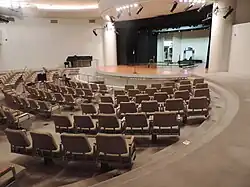 The core part of Guggenheim's interior consists of the monitor section to the north, the larger main gallery to the south and a lecture hall beneath the main gallery.[258][259] To the east of the main entrance is the bookstore, in the area that was originally part of the museum's driveway.[260] To the south of the main entrance is a small circular vestibule, which contains a floor with metal arcs and a low plaster ceiling with recessed lighting.[261] South of the main rotunda is a cafe, added during the 1990s renovation.[108][245]