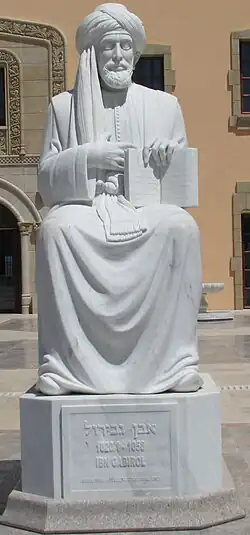 Gabirol's writings indicate that his father was a prominent figure in Córdoba, but was forced to relocate to Málaga during a political crisis in 1013.[1]: xvii Gabirol's parents died while he was a child, leaving him an orphan with no siblings or close relatives.[1]: xviii He was befriended, supported and protected by a prominent political figure of the time, Yekutiel ibn Hassan al-Mutawakkil ibn Qabrun,[6] and moved to Zaragoza, then an important center of Jewish culture.[1]: xviii Gabirol's anti-social[3] temperament, occasionally boastful poetry, and sharp wit earned him powerful enemies, but as long as Jekuthiel lived, Gabirol remained safe from them[1]: xxiv and was able to freely immerse himself in study of the Talmud, grammar, geometry, astronomy, and philosophy.[8] However, when Gabirol was seventeen years old, his benefactor was assassinated as the result of a political conspiracy, and by 1045 Gabirol found himself compelled to leave Zaragoza.[1]: xxiv [8] He was then sponsored by no less than the grand vizier and top general to the kings of Granada, Samuel ibn Naghrillah (Shmuel HaNaggid).[1]: xxv Gabirol made ibn Naghrillah an object of praise in his poetry until an estrangement arose between them and ibn Naghrillah became the butt of Gabirol's bitterest irony. It seems Gabirol never married,[1]: xxvi and that he spent the remainder of his life wandering.[9]