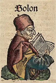 Pausanias listed Solon among the Seven Sages, whose aphorisms adorned Apollo's temple in Delphi.[42] Stobaeus in the Florilegium relates a story about a symposium where Solon's young nephew was singing a poem of Sappho's: Solon, upon hearing the song, asked the boy to teach him to sing it. When someone asked, "Why should you waste your time on it?", Solon replied, "ἵνα μαθὼν αὐτὸ ἀποθάνω", "So that I may learn it before I die."[43] Ammianus Marcellinus, however, told a similar story about Socrates and the poet Stesichorus, quoting the philosopher's rapture in almost identical terms: ut aliquid sciens amplius e vita discedam,[44] meaning "in order to leave life knowing a little more".
