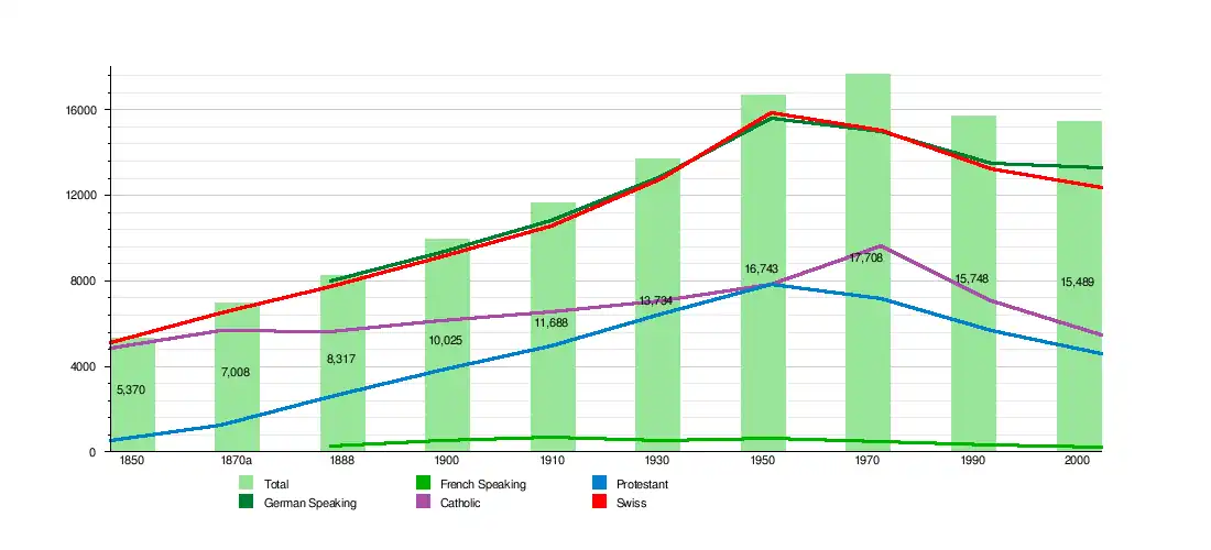 As of 2008, the gender distribution of the population was 48.1% male and 51.9% female. The population was made up of 5,891 Swiss men (37.0% of the population) and 1,775 (11.1%) non-Swiss men. There were 6,669 Swiss women (41.8%) and 1,604 (10.1%) non-Swiss women.[18] Of the population in the municipality 3,864 or about 24.9% were born in Solothurn and lived there in 2000. There were 3,630 or 23.4% who were born in the same canton, while 4,135 or 26.7% were born somewhere else in Switzerland, and 3,193 or 20.6% were born outside of Switzerland.[17]