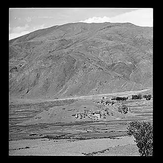 The burial mound of Songtsen Gampo surrounded by cultivated fields (Chyongye Valley, 1949)