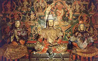 Songtsen Gampo (center), Bhrikuti Devi of Nepal (left) and Princess Wencheng (right)