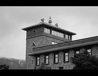 Songtsen Gampo had six consort queens, of whom four were Tibetan and two were foreign born.[12] The highest-ranking consort was Pogong Mongza Tricham (Wylie: pho gong mong bza' khri lcam, also called Mongza, "the Mong clan wife", who is said to have been the mother of Gungsong Gungtsen.[13] Other notable wives include a noble woman of the Western Xia known as Minyakza ("Western Xia wife", Wylie: mi nyag bza'),[14] and a noble woman from Zhangzhung. Well-known even today are his two foreign wives: the Nepali princess Bhrikuti ("the great lady, the Nepalese wife", Wylie: bal mo bza' khri btsun ma) as well as the Chinese Princess Wencheng ("Chinese Wife", Wylie: rgya mo bza').[12] Songtsen sponsored the building of two temples to house the images of Buddha brought by his Nepalese and Chinese wives, however he showed little interest in propagating Buddhism otherwise, and was buried according to pre-Buddhist protocols and rituals when he died.[15]