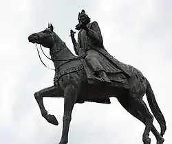 Statue of King Songtsen Gampo on horseback in front of the Songtsen Library in Dehradun, India