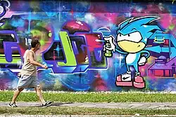 An Internet meme called "Sanic" has been used based on a poorly drawn Sonic; typically, the meme uses one of Sonic's catchphrases but with poor grammar. Sega's official Sonic Twitter account has made numerous references to it,[114] and it appeared in official downloadable content for Sonic Forces on in-game shirts.[115] The meme also appears as a drawing in the theatrical film.[116]