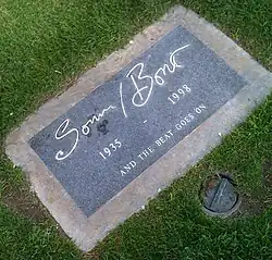 Sonny's funeral was held on January 10, 1998, at St. Theresa's Church in Palm Springs.[36] Attendees included Governor Pete Wilson, former President Gerald Ford, Speaker of the House Newt Gingrich, and Secretary of the Interior Bruce Babbitt, as the representative of the White House.[37] He was buried at Desert Memorial Park in Cathedral City, California.[38][39] His headstone reads "AND THE BEAT GOES ON".[40]