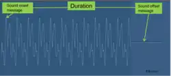 Duration is perceived as how "long" or "short" a sound is and relates to onset and offset signals created by nerve responses to sounds. The duration of a sound usually lasts from the time the sound is first noticed until the sound is identified as having changed or ceased.[26] Sometimes this is not directly related to the physical duration of a sound. For example; in a noisy environment, gapped sounds (sounds that stop and start) can sound as if they are continuous because the offset messages are missed owing to disruptions from noises in the same general bandwidth.[27] This can be of great benefit in understanding distorted messages such as radio signals that suffer from interference, as (owing to this effect) the message is heard as if it was continuous.