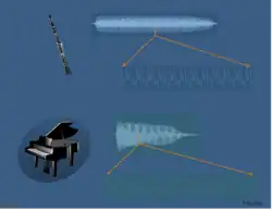 Timbre is perceived as the quality of different sounds (e.g. the thud of a fallen rock, the whir of a drill, the tone of a musical instrument or the quality of a voice) and represents the pre-conscious allocation of a sonic identity to a sound (e.g. "it's an oboe!"). This identity is based on information gained from frequency transients, noisiness, unsteadiness, perceived pitch and the spread and intensity of overtones in the sound over an extended time frame.[10][11][12] The way a sound changes over time provides most of the information for timbre identification. Even though a small section of the wave form from each instrument looks very similar, differences in changes over time between the clarinet and the piano are evident in both loudness and harmonic content. Less noticeable are the different noises heard, such as air hisses for the clarinet and hammer strikes for the piano.