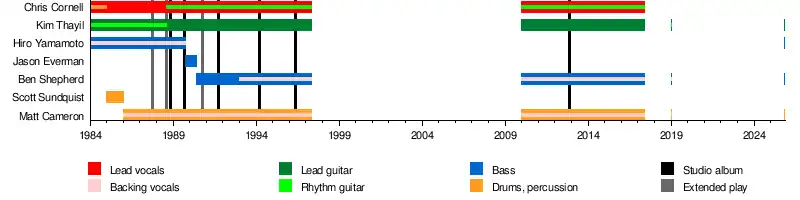 - Chris Cornell – lead vocals (1984–1997, 2010–2017; his death), rhythm guitar (1988–1997, 2010–2017), drums (1984–1985)