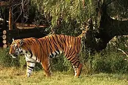 The South China tiger is a population of the Panthera tigris tigris subspecies that is native to Southern China.[1] The population mainly inhabited the Fujian, Guangdong, Hunan and Jiangxi provinces. It has been listed as Critically Endangered on the China's Red List of Vertebrates[2] and is possibly extinct in the wild since no wild individual has been recorded since the late 1980s.[3] In the late 1990s, continued survival was considered unlikely because of low prey density, widespread habitat degradation and fragmentation, and other environmental issues in China.[4] In the fur trade, it used to be called Amoy tiger.[5]