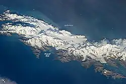 Locations currently bearing names selected by Cook include Clerke Rocks, Possession Bay, and Bay of Isles, amongst others.[21] Additional English names given many years after in recognition of past visits by American whalers in the territory include Morrell Point, Wasp Point, Pacific Point, and Comer Crag.[21] Prominent Russian-language names chosen by Bellingshausen include the Traversay Islands, Zavodovski Island, and Visokoi Island (высокий meaning "high").[21] There is also a Lowland Scots language presence within the topography of the territory, with some locations being named after notable Scottish individuals, such as Geikie Glacier[22] and Allardyce Range,[23] amongst others.[21]