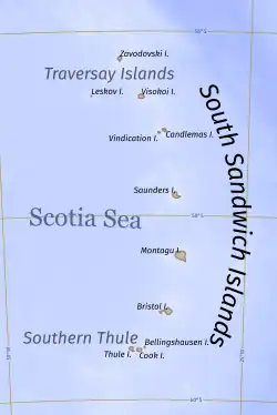 ![]() Location of South Georgia and the South Sandwich Islands in the southern Atlantic Ocean | |