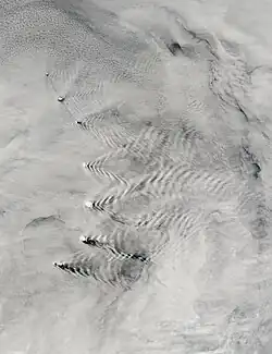 Sunshine, as with many South Atlantic Islands, is low, at a maximum of just 21.5%. This amounts to around 1,000 hours of sunshine annually. The local topography, however, also contributes significantly to the low insolation. A study published during the early 1960s[37] indicated that sunshine recording instruments remained significantly obscured throughout the year and entirely obscured during June. It was estimated that the theoretical sunshine exposure minus obstructions would be around 14% at Bird Island and 35% at King Edward Point – or, in hourly terms, ranging from around 650 hours in the west to 1,500 hours in the east. This illustrates the effect the Allardyce Range has in breaking up cloud cover.
