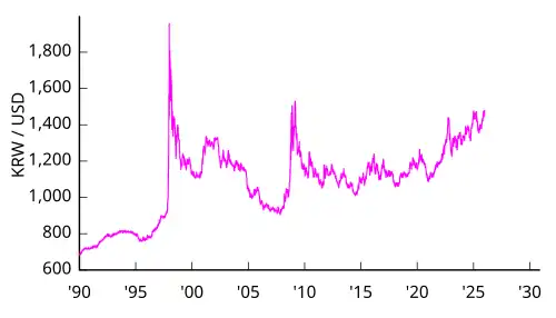 On February 27, 1980, efforts were initiated to lead to a floating exchange rate. The won was allowed to float on December 24, 1997, when an agreement was signed with the International Monetary Fund.[9] Shortly after, the won was devalued by almost half, as part of the 1997 Asian financial crisis.