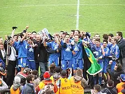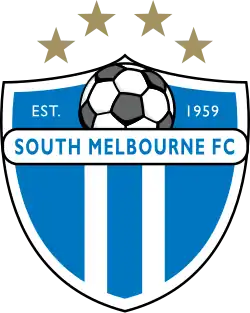 In the 1998 Grand Final, South Melbourne defeated league newcomer Carlton 2–1 with a controversial late chip by Boutsianis, sending the crowd into pandemonium.[29] That win was followed up in 1999 with a come-from-behind 3–2 win against Sydney United in the Grand Final, which was the first time the club had gone back-to-back since the glory days of the 1960s. This win would be Hellas' fourth and final national championship.[30] By now, South Melbourne had dropped the Lakers moniker and become South Melbourne Soccer Club, and sported a new emblem—the current blue and white shield with stars (each star representing a national championship). They followed up their fourth domestic title with the 1999 Oceania Club Championship, a win that qualified them for the 2000 FIFA Club World Championship in Brazil.[3]