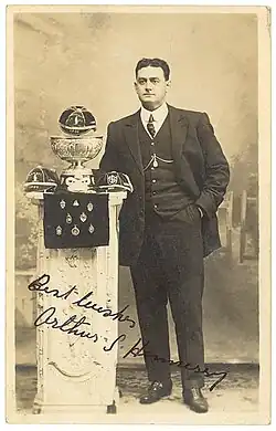 The South Sydney District Rugby League Football Club was formed at a meeting on 17 January 1908 at Redfern Town Hall[1] when administrator J. J. Giltinan, cricketer Victor Trumper and politician Henry Hoyle gathered together in front of a large crowd of supporters.[2] The club played in the first round of the newly formed New South Wales Rugby League, defeating North Sydney 11–7 at Birchgrove Oval on 20 April 1908.[2][3] The team went on to win the inaugural premiership then successfully defended its title in the 1909 season, winning the Grand Final by default.[4] During these early years Arthur Hennessy was considered the "founding father" of the South Sydney rugby league club. A hooker and prop forward, Hennessy was Souths' first captain and coach. He was also New South Wales' first captain and Australia's first test captain in 1908. S. G. "George" Ball became Club Secretary in 1911 after Arthur Hennessy stood down from the position, and he remained in that capacity for over 50 years, only retiring a few years before his death in 1969.