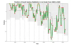 "Group 14", a collection of club backers including businessmen, politicians, musicians and media personalities, was formed before the Rabbitohs' exclusion from the NRL in 1999.[67] Members include Anthony Albanese, Laurie Brereton, Michael Cheika, Rodger Corser, Michael Daley, Andrew Denton, Cathy Freeman, Nick Greiner, Deirdre Grusovin, Ron Hoenig, Ray Martin, Mikey Robins, and Mike Whitney.[68][69] They contributed to South Sydney's bid for reinstatement, following the club's exclusion from the competition at the end of the 1999 season. A sustained campaign of public support that year, unprecedented in Australian sporting history, saw 40,000 people[70] attend a rally in the Sydney CBD in support of South Sydney's cause.[71][72] In 2000 and 2001, public street marches took place in Sydney with in excess of 80,000 people rallying behind the Rabbitohs.[21] The club also has a number of high-profile supporters as well, many of whom were dominant figures in Souths' battle to be readmitted into the premiership in 2000 and 2001.[73][74] In 2007, supporters set a new club record for attendance with an average home crowd figure of 15,702 being the highest ever since the introduction of the home and away system in 1974.[75]