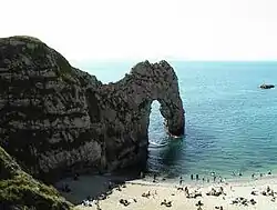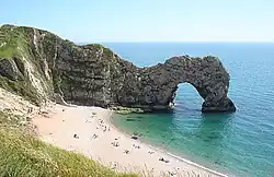 The east of the region is characterised by wide, flat clay vales, and chalk and limestone downland. The vales, with good irrigation, are home to the region's dairy agriculture. The Blackmore Vale was Thomas Hardy's "Vale of the Little Dairies";[10] another, the Somerset Levels was created by reclaiming wetlands.[11] The Southern England Chalk Formation extends into the region, creating a series of high, sparsely populated and archaeologically rich downs, most famously Salisbury Plain, but also Cranborne Chase, the Dorset Downs and the Purbeck Hills. These downs are the principal area of arable agriculture in the region. Limestone is also found in the region, at the Cotswolds, Quantock Hills and Mendip Hills, where they support sheep farming.[12] All of the principal rock types can be seen on the Jurassic Coast of Dorset and East Devon, where they document the entire Mesozoic era from west to east.[13]