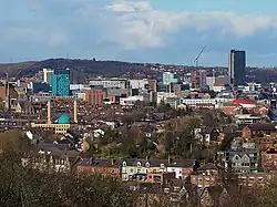 The Pennines in the west of the county are mostly inside the Peak District National Park and also contain carboniferous rocks, with the underlying geology primarily being millstone grit sandstones of the Dark Peak rising from the Yorkshire coalfield and the terrain is mostly moorland plateaus and gritstone edges.[17] The inner Pennine fringes between the Dark Peak and Yorkshire coalfield are distinguished by many steep valleys, and a transition from uplands and rural landscape to lowlands and urban landscape towards the east of the county.[18] Major rivers which cross the area are the Dearne, Rother and Don. To the east, in the Doncaster area the landscape becomes flatter as the eastward dipping carboniferous rocks of the coalfield are overlain by the lacustrine deposits of the Humberhead Levels.[19]