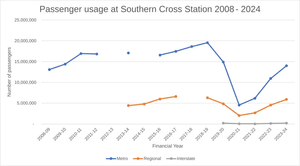Passenger usage at Southern Cross Station between 2008 and 2024 sorted by financial year and type of rail service.