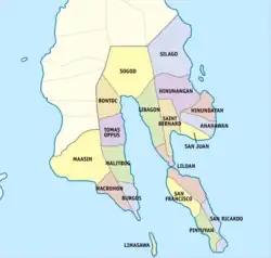 The province originally comprised 16 municipalities and 349 barangays, with four islands: Panaon Island, Limasawa Island, San Pedro Island and San Pablo Island.[9] After the inauguration of the province, three more municipalities were subsequently created: San Ricardo from Pintuyan, Tomas Oppus from Malitbog and Limasawa from Padre Burgos.