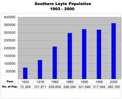 The 1980 national census recorded the province of Southern Leyte with a population of 296,294 from the historic record in 1903 of 72,369. In 1990, the population of the province increased to 321,940 which was caused by in-migration and increasing rate of birth over death. In 2000, population increased to 360,160 with a rate of 2.73 from the negative growth rate recorded in 1995 period with 317,565.[26] The sudden decrease of the 1995 records was due to the late census in the province. While regular censuses were done in May where most of the students were at their respective places of residence, in 1995 the census of the population was done in September where the students were out for schooling in nearby provinces. The decrease in population was also, theoretically, attributed to out-migration of the rural population to cities to seek better employment and livelihood opportunities. A corresponding increase on the number of households was also recorded at 72,894 households higher by 7,327 households over the 1995 figure. Southern Leyte ranked fifth in terms of population among the six provinces in Eastern Visayas with 9.98 percent of the 3.6 million persons of the region. On the contrary, it was the fastest-growing province in the region. At the national level, the province contributed 0.47 percent to the total population of the Philippines with 76.5 million.[26]