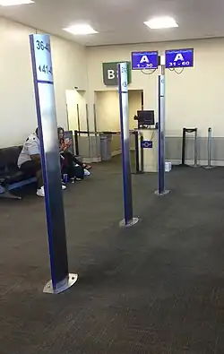 Southwest currently has an open seating policy, scheduled to end on January 26, 2026,[29] and uses a unique boarding process. Passengers are given a group letter (A, B or C) and a number (1 through 60). Passengers lineup in numerical order within each letter group and choose any open seat on the aircraft.[30] A 2012 study on the television series MythBusters, found this to be the fastest method currently in use for passengers to board a plane; on average, it is 10 minutes faster than the standard method.[31]