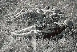 Another example of the destruction battalions' actions is the Kautla massacre, where twenty civilians were murdered and tens of farms and houses looted, burned down or destroyed, with many of the people killed after being tortured and beaten by Soviet troops. The low toll of human deaths in comparison with the number of burned farms is due to the Erna long-range reconnaissance group breaking the Red Army blockade on the area, allowing many civilians to escape.[100][101]