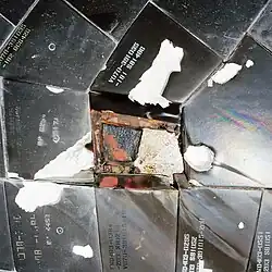 During the launch of STS-27 in 1988, a piece of insulation shed from the right solid rocket booster struck the underside of the vehicle, severely damaging over 700 tiles and removing one tile altogether.[10] The crew were instructed to use the remote manipulator system to survey the condition of the underside of the right wing, ultimately finding substantial tile damage. Due to the classified nature of the mission, the only images transferred to the mission control center were encrypted and of extremely poor quality. Mission control personnel deemed the damage to be "lights and shadows" and instructed the crew to proceed with the mission as usual, infuriating many of the crew. Upon landing, Atlantis became the single-most-damaged shuttle to successfully land. The survival of the crew is attributed to a steel L band antenna plate which was positioned directly under the missing tile.[11] A similar situation would eventually lead to the loss of the shuttle Columbia in 2003, albeit on the more critical reinforced carbon-carbon.[12]