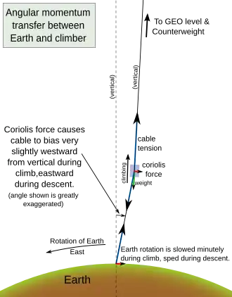 As a payload is lifted up a space elevator, it would gain not only altitude, but horizontal speed (angular momentum) as well. The angular momentum is taken from the Earth's rotation. As the climber ascends, it is initially moving slower than each successive part of cable it is moving on to. This is the Coriolis force: the climber "drags" (westward) on the cable, as it climbs, and slightly decreases the Earth's rotation speed. The opposite process would occur for descending payloads: the cable is tilted eastward, thus slightly increasing Earth's rotation speed.