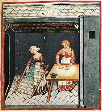 By the middle of the 12th century, records exist of several farms in Sicily producing itriyya at scale for local and export markets.[8] Over the following centuries, this pasta appeared in Italian cookbooks, albeit infrequently.[9] A precise description of the manufacture of "Sicilian macaroni" is given by Martino da Como in the later 15th century: a ball of dough, stretched thin, cut with a wire as "thin as spagho (string)", dried under the sun.[10] The duration of this drying process varied with weather and humidity, but twelve days in the summer was typical.[11] In another recipe for a Genoese pasta, Martino employs spagho for the first time in a culinary context when he says pasta ought to be cut "as thin as a spagho".[10] Several tools were employed for this cutting process, including chitarra in areas of southern Italy, which consisted of a wooden frame strung with wires, lowered onto the dough.[12]