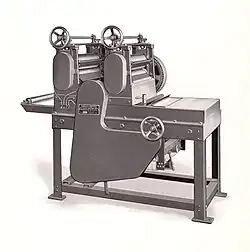 A hydraulic press with an automatic spreader by the Consolidated Macaroni Machine Corporation, Brooklyn, New York. This machine was the first to spread long cut alimentary paste products onto a drying stick. -