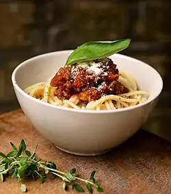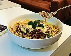 Spaghetti (Italian: [spaˈɡetti]) is a long, thin, solid, cylindrical pasta.[1] It is a staple food of traditional Italian cuisine. Like other pastas, spaghetti is made of milled wheat (sometimes enriched with vitamins and minerals) and water. Italian spaghetti is typically made from durum-wheat semolina.[2] The pasta is usually white because refined flour is used, but whole wheat flour may be added.[3] Spaghettoni is a thicker form of spaghetti, while spaghettini is a thinner form. Capellini is a very thin spaghetti, while vermicelli refers to intermediate thicknesses.