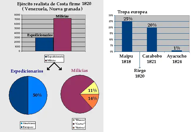 The American militias reflected the racial make-up of the local population. For example, in 1820 the royalist army in Venezuela had 843 white (español), 5,378 Casta, and 980 Indigenous soldiers.