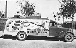 A few well-known people fought on the Republican side, such as English writer George Orwell (who wrote Homage to Catalonia (1938), an account of his experiences in the war)[176] and Canadian thoracic surgeon Norman Bethune, who developed a mobile blood-transfusion service for front-line operations.[177] Simone Weil briefly fought with the anarchist columns of Buenaventura Durruti.[178]