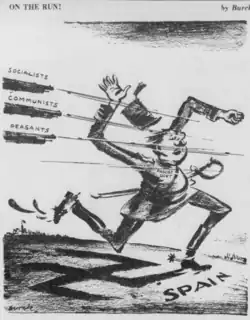 The war was cast by Republican sympathisers as a struggle between tyranny and freedom, and by Nationalist supporters as communist and anarchist red hordes versus Christian civilisation.[113] Nationalists also claimed they were bringing security and direction to an ungoverned and lawless country.[113] Spanish politics, especially on the left, was quite fragmented: on the one hand socialists and communists supported the republic but on the other, during the republic, anarchists had mixed opinions, though both major groups opposed the Nationalists during the Civil War; the latter, in contrast, were united by their fervent opposition to the Republican government and presented a more unified front.[150]