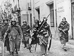 As the war progressed, the government and the communists were able to exploit their access to Soviet arms to restore government control over the war effort, through diplomacy and force.[148] Anarchists and the POUM were integrated into the regular army, albeit with resistance. The anti-Stalinists of POUM were outlawed and denounced by the Soviet-aligned Communists as an instrument of the fascists.[148] In the May Days of 1937, many thousands of anarchist and communist Republican soldiers fought for control of strategic points in Barcelona.[149]