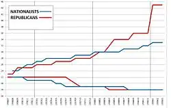 Laia Balcells observes that polarisation in Spain just before the coup was so intense that physical confrontations between leftists and rightists were a routine occurrence in most localities; six days before the coup occurred, there was a riot between the two in the province of Teruel. Balcells notes that Spanish society was so divided along Left-Right lines that the monk Hilari Raguer stated that in his parish, instead of playing "cops and robbers", children would sometimes play "leftists and rightists".[87] Within the first month of the Popular Front's government, nearly a quarter of the provincial governors had been removed due to their failure to prevent or control strikes, illegal land occupation, political violence and arson. The Popular Front government was more likely to prosecute rightists for violence than leftists who committed similar acts.[88] Between February and July, approximately 300 to 400 deaths occurred from political violence, while hundreds of churches, religious buildings and monuments were destroyed, damaged, or vandalised.[89][90]