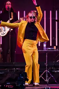 Their next studio album, The Girl Is Crying in Her Latte, and a world tour were confirmed for 2023.[9][81] Sparks re-signed to Island Records in January 2023.[9] The album's lead single, "The Girl Is Crying in Her Latte", features a music video released on March 3 with Australian actor Cate Blanchett dancing to the song. It was the best selling physical album in the UK on the week of release,[82] and the tour supporting it included some remarkable firsts for the band: Two shows at the Royal Albert Hall, the Glastonbury Festival (featuring Cate Blanchett), the Hollywood Bowl with They Might Be Giants, and the Sydney Opera House.
