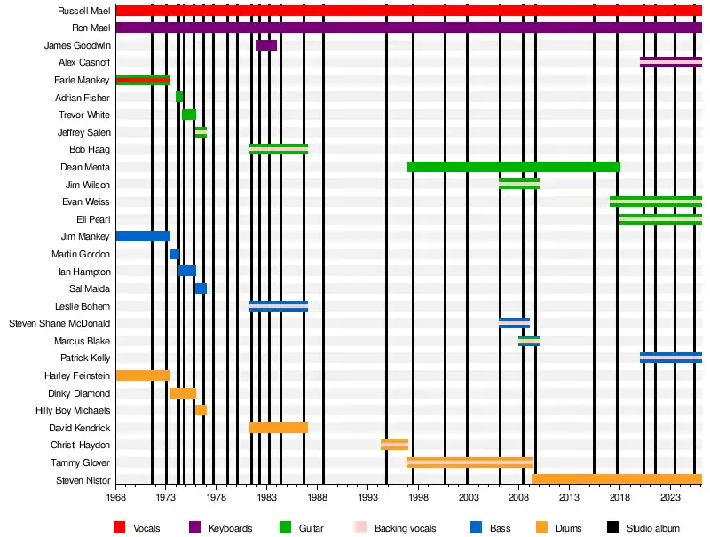 Sparks is an American pop and rock duo consisting of brothers Ron (keyboards) and Russell Mael (vocals), formed in 1968 in the Pacific Palisades, Los Angeles as the band Halfnelson. The duo is noted for their quirky approach to songwriting;[1] their music is often accompanied by sophisticated and acerbic lyrics—sometimes containing literary or cinematic references[2]—and an idiosyncratic, theatrical stage presence, typified by the contrast between Russell's animated, hyperactive frontman antics and Ron's deadpan scowling. Russell Mael has a distinctive wide-ranging voice, while Ron Mael plays keyboards in an intricate and rhythmic style. Their frequently changing styles and visual presentations have kept the band at the forefront of modern, artful pop music.[3][4]