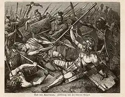 When the legions managed to catch a portion of the rebels separated from the main army,[47] discipline among Spartacus's forces broke down as small groups independently attacked the oncoming legions.[48] Spartacus now turned his forces around and brought his entire strength to bear on the legions in a last stand, in which the rebels were routed completely, with the vast majority of them being killed on the battlefield.[49]