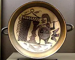 Throughout their adult lives, the Spartiates continued to be subject to a training regime so strict that, as Plutarch says, "... they were the only men in the world with whom war brought a respite in the training for war."[27] Bravery was the ultimate virtue for the Spartans: Spartan mothers would give their sons the shield with the words "[Return] With it or [carried] on it!" (Ἢ τὰν ἢ ἐπὶ τᾶς),[28] that is to say, either victorious or dead, since in battle, the heavy hoplite shield would be the first thing a fleeing soldier would be tempted to abandon –- rhipsaspia, "dropping the shield", was a synonym for desertion in the field.[29]