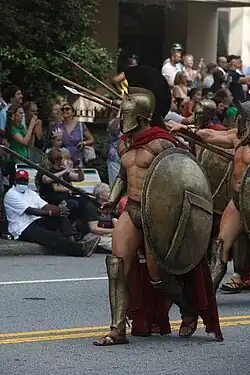 The Spartan hoplite followed a strict laconic code of honor. No soldier was considered superior to another.[47] Suicidal recklessness, misbehavior, and rage were prohibited in the Spartan army, as those behaviours endangered the phalanx. Recklessness could also lead to dishonor, as in the case of Aristodemus.[49] Spartans regarded those who fight, while still wishing to live, as more valorous than those who don't care if they die.[49] They believed that a warrior must not fight with raging anger but with calm determination.[50] Spartans must walk without any noise and speak only with few words by the laconic way of life.[47] Other ways for Spartans to be dishonored include dropping the shield (rhipsaspia), failing to complete the training, and deserting in battles. Dishonored Spartans were labelled as outcasts and would be forced to wear different clothing for public humiliation.[47] In battles, the Spartans told stories of valor to inspire the troops and, before a major confrontation, they sang soft songs to calm the nerves.[51]