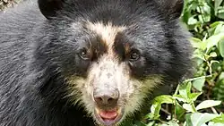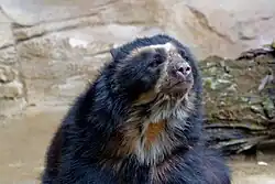 Tremarctos ornatus is commonly referred to in English as the "spectacled bear", a reference to the light colouring on its chest, neck and face, which may resemble spectacles in some individuals, or the "Andean bear" for its distribution along the Andes. The root trem- comes from a Greek word meaning "hole"; arctos is the Greek word for "bear". Tremarctos is a reference to an unusual hole on the animal's humerus. Ornatus, Latin for "decorated", is a reference to the markings that give the bear its common English name.[3] T. ornatus is locally known as jukumari (Aymara and Quechua), ukumari or ukuku (Quechua); translating to "hole bear", the tan facial markings usually appear on the face except around the bear's eyes, making it look like the bear has holes for eyes [4][5][6]