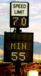 In the United States, heavily traveled portions of the New Jersey Turnpike began using variable speed limit signs in combination with variable message signs in the late 1960s. Officials can adjust the speed limit according to weather, traffic conditions, and construction.[70] More typically, variable speed limits are used on remote stretches of highway in the United States in areas with extreme changes in driving conditions.[71] For example, variable limits were introduced in October 2010 on a 52-mile (84 km) stretch of Interstate 80 in Wyoming, replacing the winter season speed reduction from 75 to 65 mph (121 to 105 km/h) that had been in place since 2008.[72][73] This Variable Speed Limit system has been proven effective in terms of reducing crash frequency and road closures.[74][75] Similarly, Interstate 90 at Snoqualmie Pass and other mountain passes in Washington State have variable speed limits as to slow traffic in severe winter weather.[71][76] As a response to fog-induced chain-reaction collisions involving 99 vehicles in 1990, a variable speed limit system covering 19 miles (31 km) of Interstate 75 in Tennessee was implemented in fog-prone areas around the Hiwassee River.[77] The Georgia Department of Transportation installed variable speed limits on part of Interstate 285 around Atlanta in 2014. These speeds can be as low as 35 mph (56 km/h) but are generally set to 35 mph (56 km/h).[78] In 2016, the Oregon Department of Transportation installed a variable speed zone on a 30 mi (48 km) stretch of Interstate 84 between Baker City and Ladd Canyon. The new electronic signs collect data regarding temperature, skid resistance, and average motorist speed to determine the most effective speed limit for the area before presenting the limit on the sign. This speed zone was scheduled to be activated November 2016. Ohio established variable speed limits on three highways in 2017, then in 2019 granted the authority to the Ohio Department of Transportation to establish variable limits on any of its highways.[79][80]