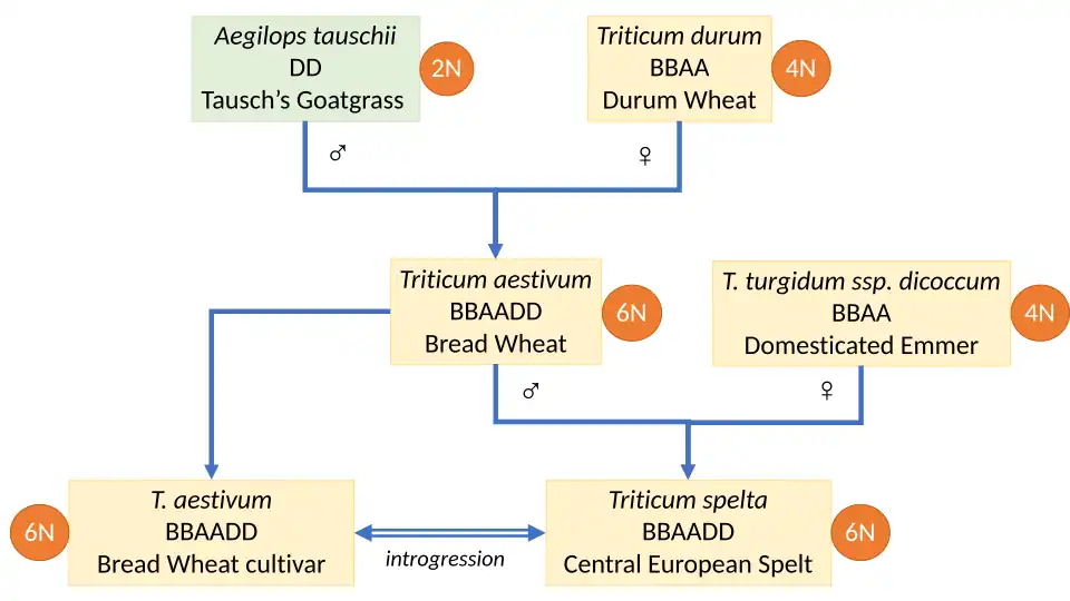 Like common wheat, spelt is a hexaploid wheat species, which means it has six sets of chromosomes. It is derived from a hybridisation event between a domesticated tetraploid wheat such as durum wheat and another wheat species, increasing the number of sets of chromosomes.[10] Genetic evidence indicates an initial hybridisation of a domesticated tetraploid wheat and the diploid wild goat-grass Aegilops tauschii. It further shows that spelt could have arisen as the result of a second hybridisation, this time of bread wheat and emmer, giving rise to European spelt.[10][11] The spelt genome continues to influence the breeding of modern hexaploid bread wheat through recent hybridisation.[12]
