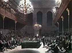 When Perceval took his seat in the House of Commons in September 1796, his political views were already formed. "He was for the constitution and Pitt; he was against Fox and France", wrote his biographer Denis Gray.[10] During the 1796–1797 session, he made several speeches, always reading from notes. His public speaking skills had been sharpened at the Crown and Rolls debating society when he was a law student. After taking his seat in the House of Commons, Perceval continued with his legal practice, as MPs did not receive a salary, and the House only sat for a part of the year. During the Parliamentary recess of the summer of 1797, he was senior counsel for the Crown in the prosecution of John Binns for sedition. Binns, who was defended by Samuel Romilly, was found not guilty. The fees from his legal practice allowed Perceval to take out a lease on a country house, Belsize House in Hampstead.[11]