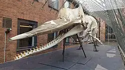 In 1853, one sperm whale was reported at 62 feet (19 m) in length, with a head measuring 20 feet (6.1 m).[46] Large lower jawbones are held in the British Natural History Museum and the Oxford University Museum of Natural History, measuring 5 metres (16 ft) and 4.7 metres (15 ft), respectively.[44]