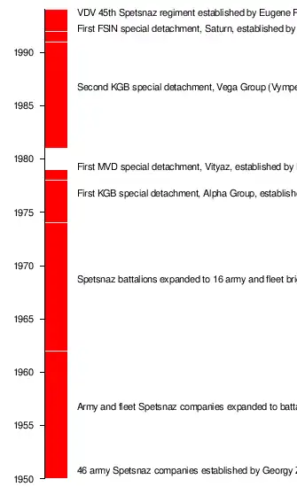 By the end of the Second World War the Soviet Union dissolved most of the special units. At the end of the 1950s the KGB and GRU set new special forces units up. The 3rd guard special-reconnaissance-brigade was founded in 1966, being stationed with the Soviet forces in East Germany in Fürstenberg/Havel.